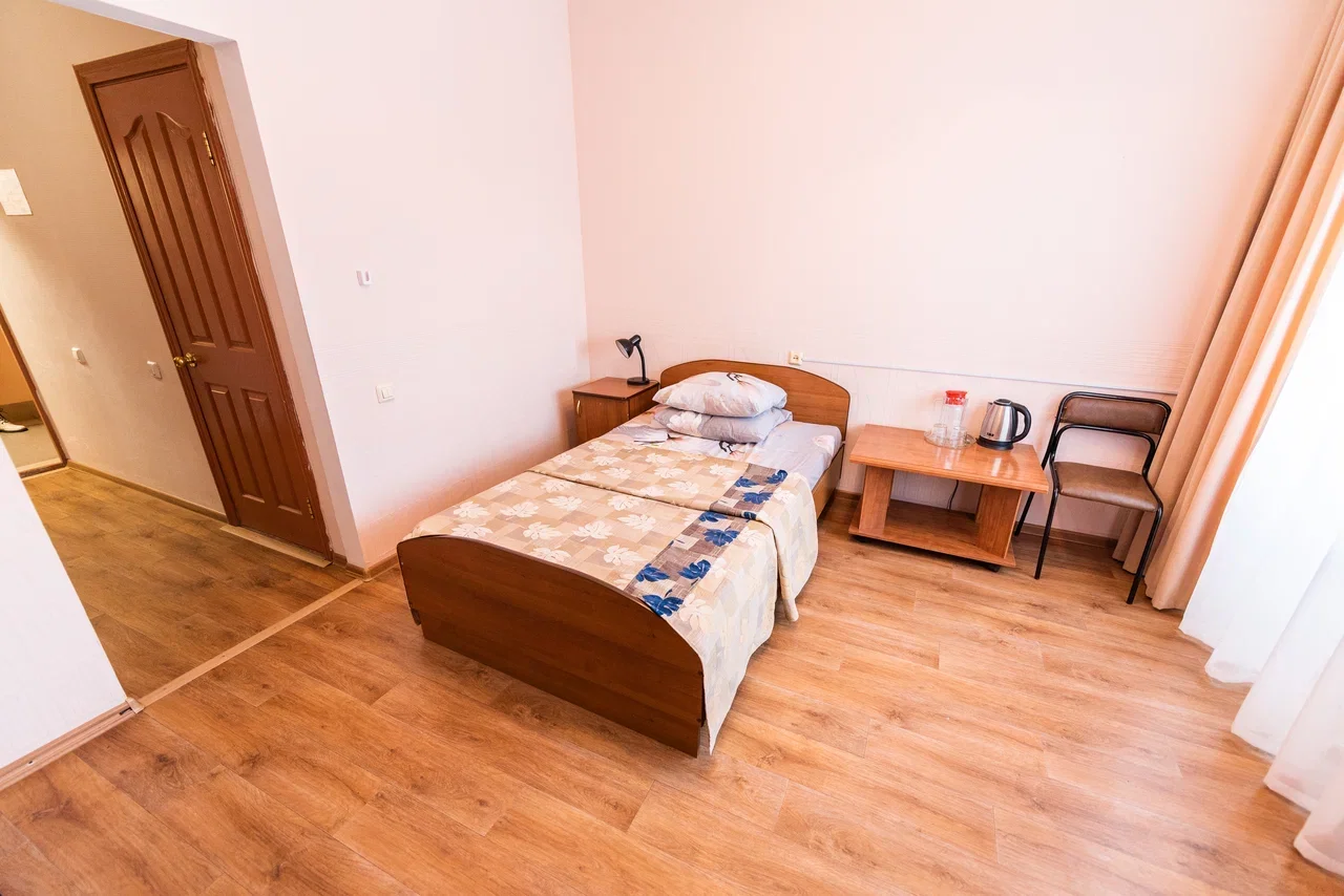 Оснащение номера: кровать двуспальная, прикроватная тумбочка, стол, стул, шкаф, телевизор, холодильник, чайный набор посуды, электрочайник
